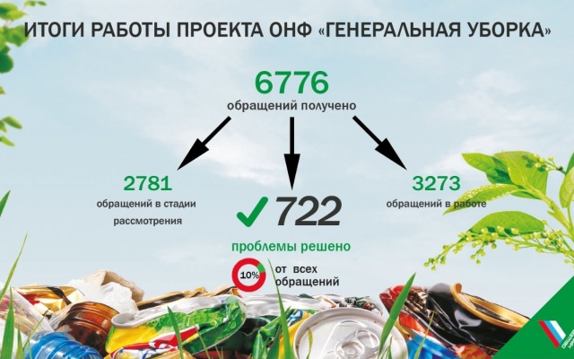 В частности, как пишет официальный микроблог ОНФ, благодаря проекту "Генеральная уборка" за три с половиной месяца было выявлено 6,8 тысяч несанкционированных свалок и уже решено 722 проблемы.