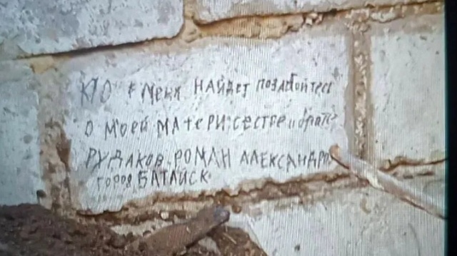 RT отмечает, что автором послания был 22-летний Роман Рудаков, входивший в состав штурмовой группы 103-го полка 150-й мотострелковой дивизии. По сведениям канала, кирпич с надписью извлекли из стены дома, командир полка решил сделать из него памятный знак, который будет храниться в штабе со знаменем части.