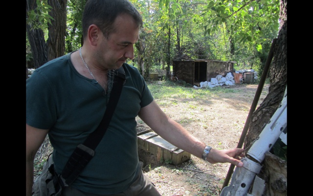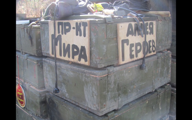 Собственно, эти ящики, а также следы от прямых попаданий, от осколков, обломки прилетевших с украинской стороны снарядов, стоящая наготове техника, полностью рассеивают радужные ассоциации с лагерем труда и отдыха. Это лагерь труда и боя. Это война.