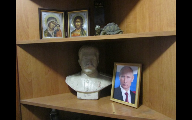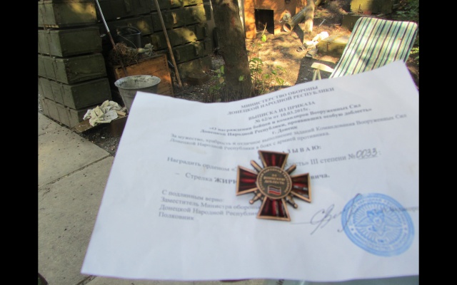 С верхних этажей командир Жора ведёт Евгения Ивлева в подвал, здесь живут те, кто несёт караул в окопах. Из комфорта здесь только прохлада, необходимая в зной. В комнатах мебель, собранная по частям: деревянные кровати, тумбочки, шкафчики. Жилье украшено, но не с юмором, который мы видели в лагере. Здесь линия огня, линия жизни и смерти. В комнатах много икон, есть собственные талисманы. Некоторые бойцы в их качестве хранят портреты Иосифа Сталина и Владимира Путина, говорят, и вдохновляют, и от пули берегут.