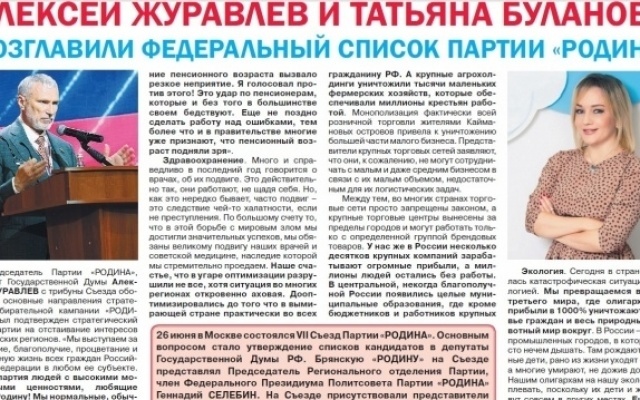В июльском выпуске газеты "Голос РОДИНЫ. Брянск" (электронная версия газеты: "Голос РОДИНЫ. Брянск") опубликованы материалы о выдвижении партией "РОДИНА" кандидатов в депутаты Государственной Думы.