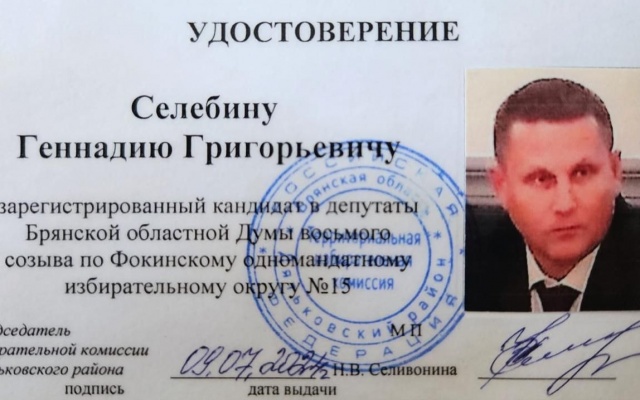 9 июля 2024 г. Территориальная избирательная комиссия Дятьковского района Брянской области зарегистрировала директора ГБУК "Брянская областная научная библиотека им. Ф. И. Тютчева" Геннадия Селебина кандидатом в депутаты Брянской областной Думы восьмого созыва по Фокинскому одномандатному избирательному округу №15.