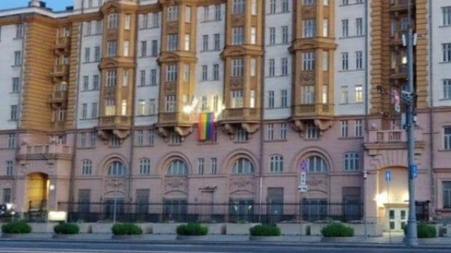 В четверг утром на здании посольства США появился флаг ЛГБТ-сообщества. Сообщается, что таким образом сотрудники посольства выразили солидарность с так называемым "месяцем гордости".