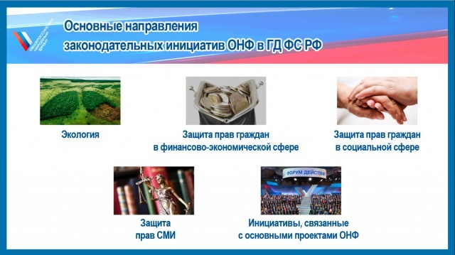 ОНФ определил пять направлений законотворческой деятельности на очередной ю сессии Госдумы. Это экология, защита прав граждан в финансово-экономической и в социальной сфере, защита прав средств массовой информации, а также законодательные инициативы, связанные с основными проектами Народного фронта.