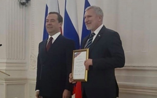 В присутствии Председателя Государственной Думы Вячеслава Володина благодарность Правительства РФ вручил заместитель Председателя Совета безопасности РФ Дмитрий Медведев.