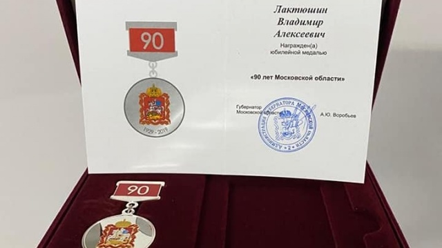 Губернатор Московской области Андрей Воробьев наградил лидера молодежного крыла партии «РОДИНА» — движения «ТИГРЫ РОДИНЫ», члена Политсовета партии Владимира Лактюшина юбилейной медалью "90 лет Московской области".