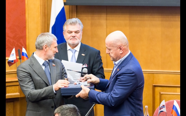 Также, в честь своего дня рождения, председатель регионального отделения партии "РОДИНА" Андрей Петров получил от партии памятные подарки.