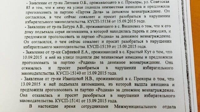 По словам очевидцев, люди на автомобиле Nissan белого цвета с номером Н315ЕТ предлагают жителям района по 10 000 рублей за заявления с подтверждением, что их подкупили в день выборов (смотрите приложение).