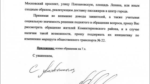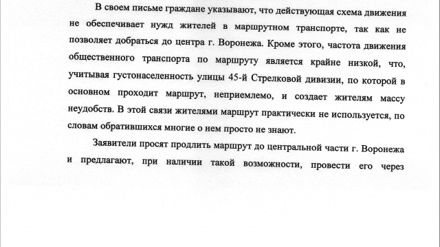 Жители жаловались, что маршрут №22 (ж-д вокзал Воронеж 1 – ВРТТЗ) в его действующей схеме движения не обеспечивает их нужд, так как не позволяет добраться до центра города. Также частота движения маршрута является крайне низкой.