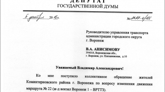 На проблему обратил внимание депутат Госдумы от Воронежской области Алексей Журавлев. Под обращением к депутату подписалось около тысячи жителей Коминтерновского района. Выяснилось, что в изменении пути следования маршрута заинтересован и перевозчик. В администрацию городского округа г. Воронеж депутатом Журавлевым был направлен соответствующий депутатский запрос.