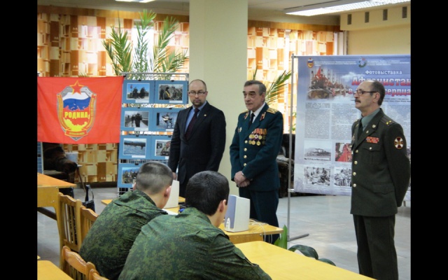 Фотовыставку представили член бюро Совета регионального отделения партии "РОДИНА" Сергей Седнев, председатель Совета местного отделения в Озерском городском округе Владимир Новик и активист партии "РОДИНА" Анатолий Трушачкин. В открытии фотовыставки приняли участие председатель местного отделения ДОСААФ России Антон Чучалин, военнослужащие 93-й ордена Красной Звезды дивизии внутренних войск МВД России, курсанты военных училищ, находящиеся на стажировке, участники боевых действий и жители г.Озерска.