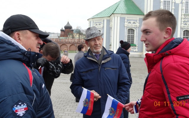 В 12.00 партийцы стали частью массового тематического флэшмоба, который был организован на стенах Тульского кремля. Около тысячи человек выстроились в шеренгу по всей окружности стен и подняли части триколора, который сложился в огромный флаг России.