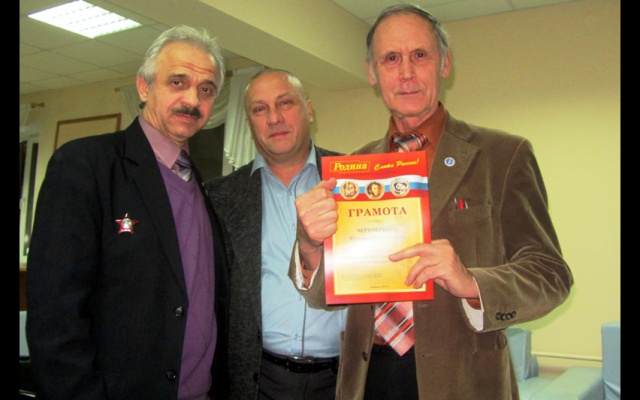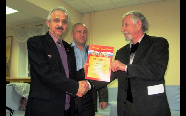 Лидер челябинской "РОДИНЫ" Фёдор Юрин вручил грамоты партии "РОДИНА" членам челябинского Дома ученых, активно помогавшим кандидату в депутаты от партии "РОДИНА" Олегу Авилову на муниципальных выборах 14 сентября 2014 года.