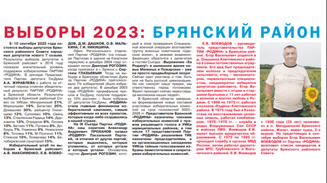 9 - 10 сентября 2023 года состоятся выборы депутатов Брянского районного Совета народных депутатов нового 7 созыва. Результаты выборов депутатов в Брянский райсовет в 2018 году показали значительный уровень поддержки избирателями ПАРТИИ "РОДИНА". В докладе Председателя Партии, депутата ГосДумы А.А. ЖУРАВЛЕВА о работе за отчетный период отмечен убедительный результат ПАРТИИ «РОДИНА» в Брянской области. Результаты выборов в Брянский районный Совет по УИКам: Мичуринский 21%, Меркульево 19%, Батагово 20%, Домашово 30%, райцентр Глинищево 12%, Супонево 10%, Свень 13%, Стеклянная Радица 14%, Дарковичи 13%, Отрадное 8%, Госома 10%, Бетово 11%, Путевка 8%, Добрунь 7%, Глаженка 9%, Новоселки 8%, Титовка 11%, М.Полпино 11%, Стяжное 10%, Толмачево 14%, Белобережский санаторий 15%.
