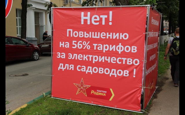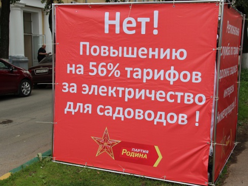 "Нет повышению на 56% тарифов на электроэнергию для садоводов!" Куб с таким лозунгом был установлен под окнами руководства РСТ, рекомендовавшего сбытовой компании резко увеличить расценки на электричество для владельцев дачных участков.