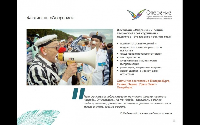 22 июня 2016 года в актовом зале новосибирской школы № 137 состоялся рабочий показ программы Всероссийского Фестиваля студий творческого развития К. Хабенского "Оперение-2016". С этой программой 48 талантливых ребят поедут на Фестиваль. В начале показа прозвучали слова благодарности тем людям, благодаря которым смогла осуществиться мечта юных талантов. Огромное спасибо депутату Совета депутатов города Новосибирска, руководителю регионального штаба политической партии "РОДИНА" Вячеславу Илюхину за поддержку студии в тяжелое финансовое время, за возможность выехать на престижный Всероссийский Фестиваль "Оперение-2016".