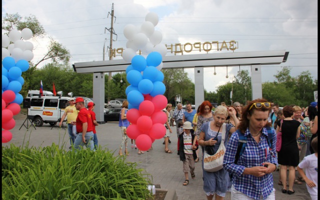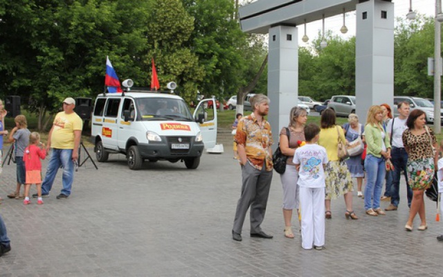 Жителей и гостей областного центра у главного входа в Центральный парк встречал специально оборудованный микроавтобус "РОДИНЫ", из акустических систем которого звучали патриотические песни, современные и прошлых лет.