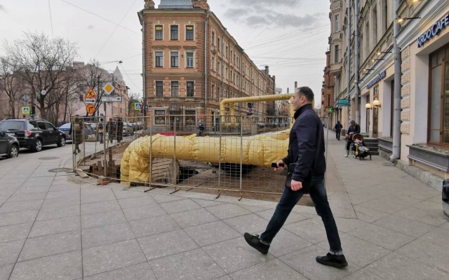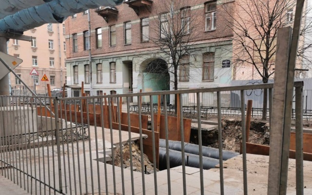 Через квартал от Невской Ратуши, на углу 9-ой Советский и Кирилловской разрыта траншея. Люди пишут, что эти баррикады тут уже два года. Информационная табличка гласит, что объект на реконструкции и срок окончания работ - май 2021. Но очевидно, что воздушная теплотрасса так и останется воздушной. Исторический облик города нарушен.