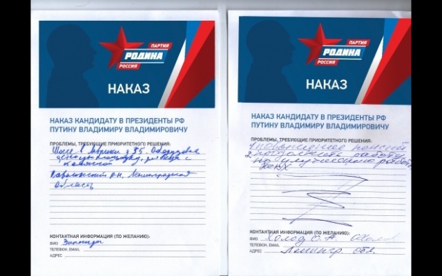Ленинградское областное отделение партии "РОДИНА" перешлет все собранные наказы федеральному партийному руководству, чтобы оно, в свою очередь, донесло их до адресата.
