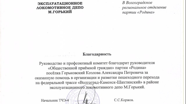 Член партии "РОДИНА" Александр Козлов, проживающий в поселке Горьковский, ответственно отнесся к данному обращению. И при поддержке заместителя председателя Совета регионального отделения партии "РОДИНА" Натальи Латышевской добился организации пешеходного перехода в данном районе. Это отметили в РЖД. Железнодорожники поблагодарили волгоградское отделение партии "РОДИНА" за участие в решении проблемы, а также отметили особый вклад Козлова в оказании помощи в строительстве моста.