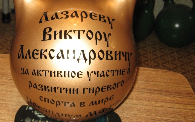 Представители Президиума Международной Федерации гиревых видов спорта выразили Виктору Лазареву благодарность за активное участие в развитии гиревого спорта и вручили ему "Золотую гирю", отметив, что самарский спортсмен всегда становился победителем соревнований, в которых принимал участие, и всегда занимал только первые места.