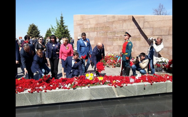 После минуты молчания, прозвучавшего гимна страны и ружейных залпов почетного караула, началась торжественная церемония возложения цветов к Вечному огню у горельефа Скорбящей Матери-Родине.