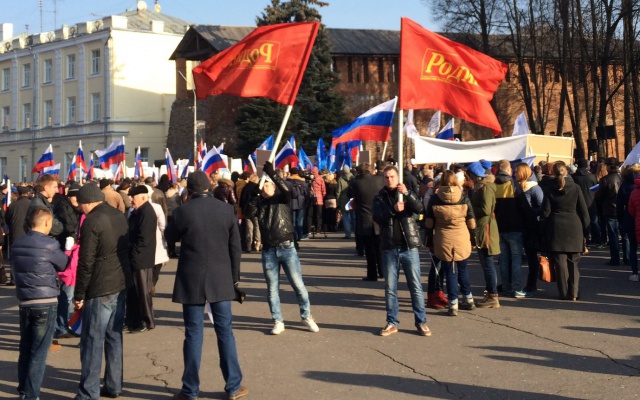 Соратники партии "РОДИНА" прошли по городу с партийной символикой.