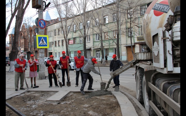 На субботнике патриоты и соратники партии переложили и укрепили гранитные плиты тротуара, забетонировали участки, где ремонт гранитного покрытия был уже невозможен, сделали бетонные отмостки.