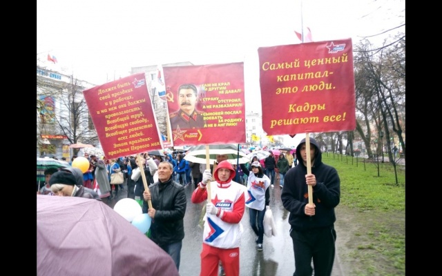 Ульяновские активисты выступали под лозунгами: "Кадры решают всё", "Самый ценный капитал - это люди", "Всеобщий труд, всеобщую свободу, всеобщее равенство всех людей", "Кто не работает, тот ни ест".
