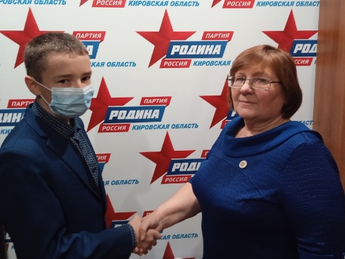 На днях руководитель организационного отдела "РОДИНЫ" Светлана Масленникова поздравила учащегося 9 класса Кировского физико-математического лицея Глеба Холманских, который вошел в новый состав Детского общественного совета при Уполномоченном по правам ребенка в числе 25 самых активных ребят из региональных общественных объединений и организаций, волонтерских отрядов, детских медиацентров, школьных органов самоуправления. Ранее лицеист выступил на первом заседании детсовета и рассказал о наиболее значимых инициативах и акциях, в которых он вместе с одноклассниками принимает участие. Среди них Глеб Холманских особое место отводит ежегодному посещению блокадника-ленинградца Юрия Андреевича Павлухина. Как он подчеркивает, "особенностью нашей инициативы является добровольность и систематичность, а также — желание лично поздравить ветерана и поучаствовать в диалоге с представителем другой, такой далекой героической эпохи".