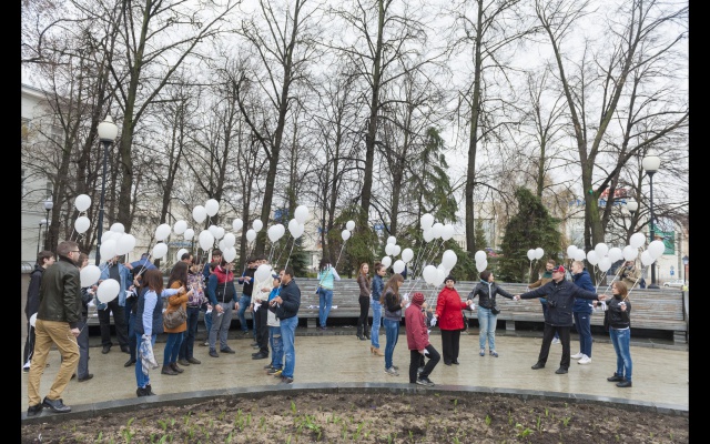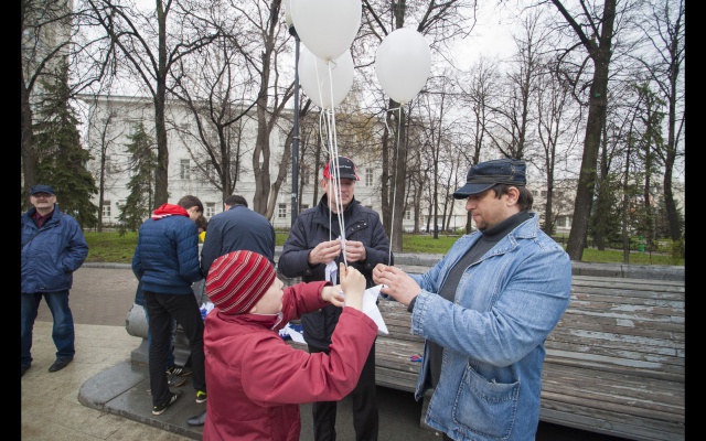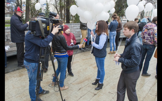 Участники, люди разных возрастов, большинство, конечно, студентов, сложили из бумаги белых голубей, по технике оригами. Тех, кто делал это впервые научили более опытные участники. Затем каждого "голубя мира" привязали к белому воздушному шару. Выстроившись в слово "мир", в едином порыве под дружный хор "Мы - за мир на Украине!" участники "запустили" в небо своих "голубей". К слову, в акции принимали участие и просто случайные прохожие-гости из Москвы, заинтересовавшиеся действом и поддержавшие идею мира на Украине.