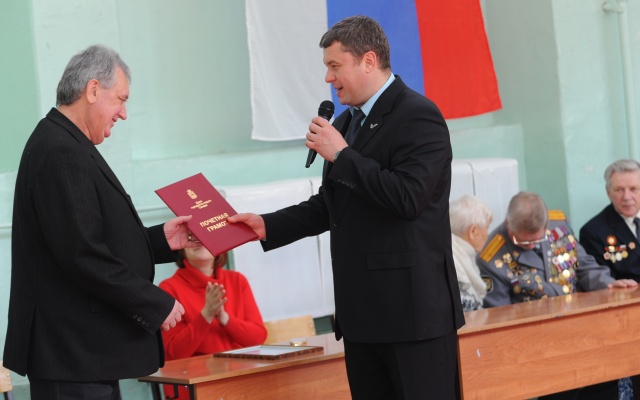Валерий Барсук поблагодарил директора Школы № 170 Александра Моисеенко за большой личный вклад в военно-патриотическое воспитание молодежи и вручил ему почетную грамоту Думы городского округа Самара за заслуги перед городским сообществом.