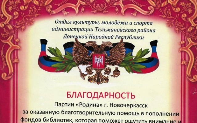 В документе за подписью начальника отдела культуры молодёжи и спорта администрации Тельмановского района Донецкой республики И. В. Клещуновой содержатся слова признательности за оказанную благотворительную помощь в пополнении фондов библиотек, неравнодушное отношение к проблемам детей и взрослых района в нелегкое для непризнанной республики время.
